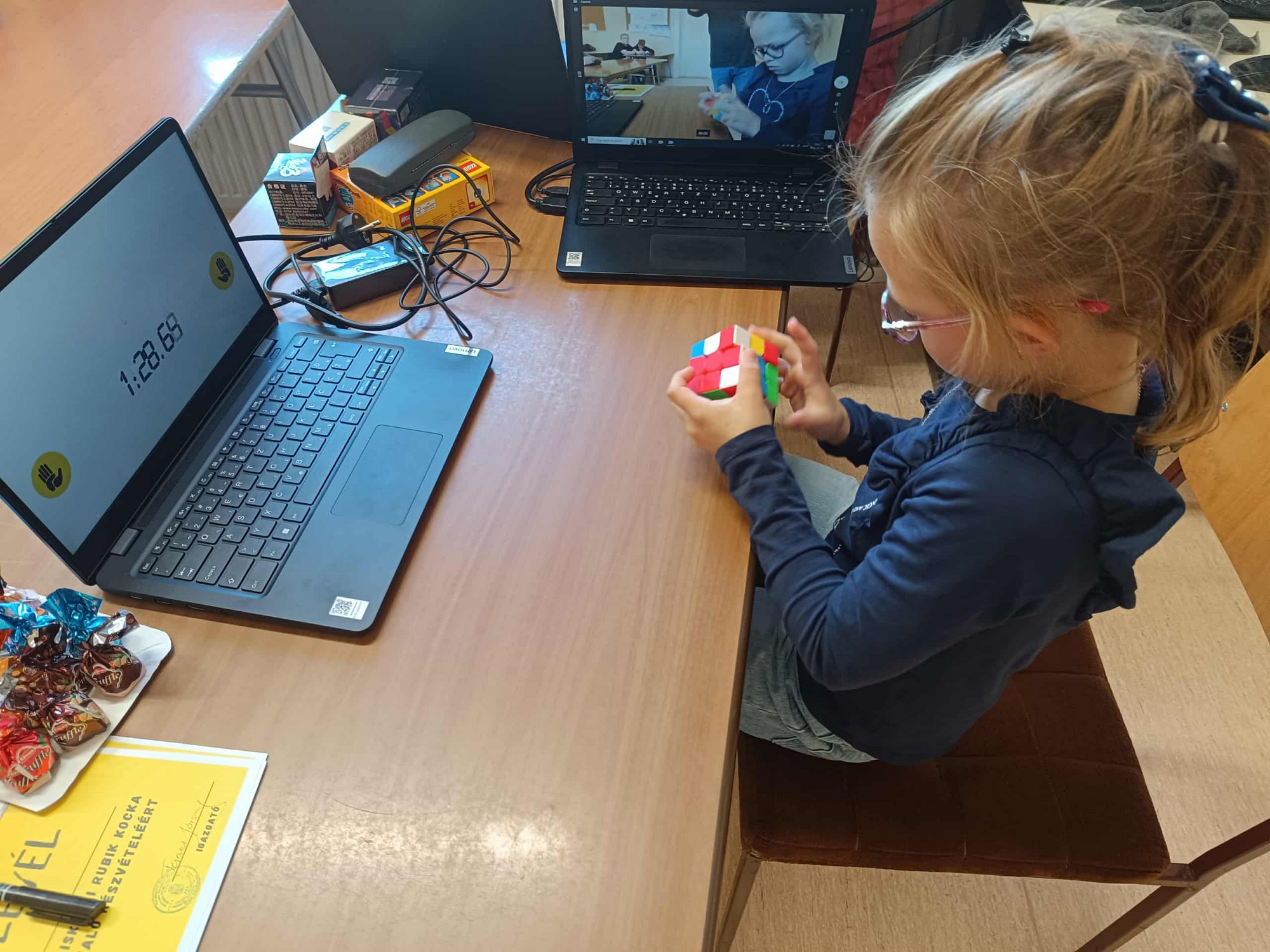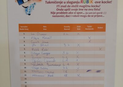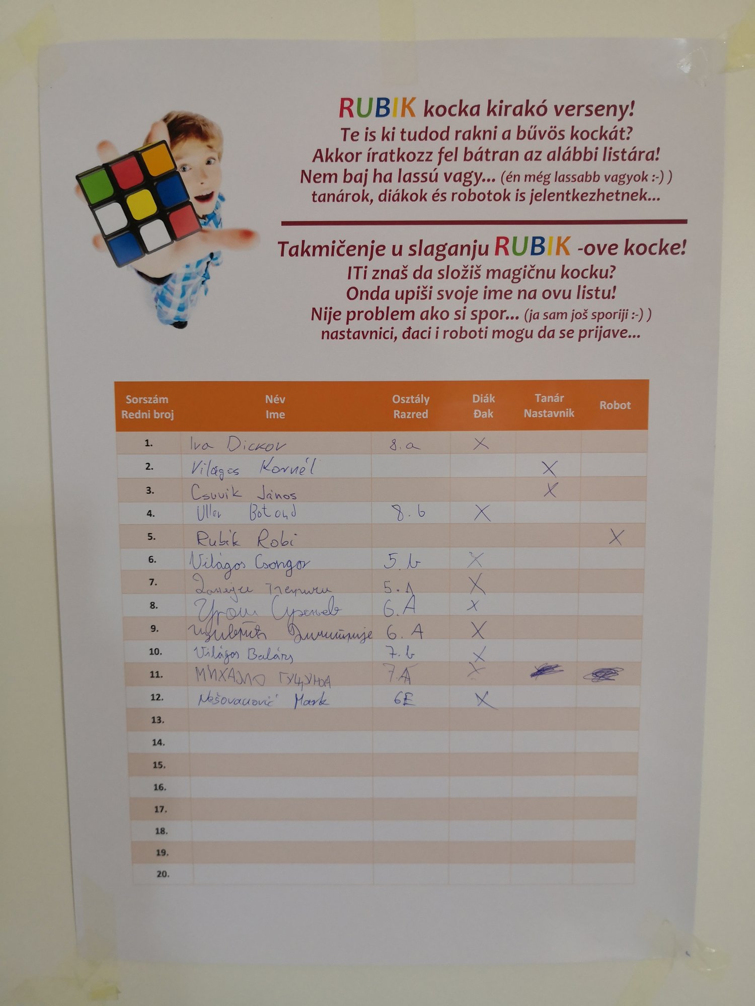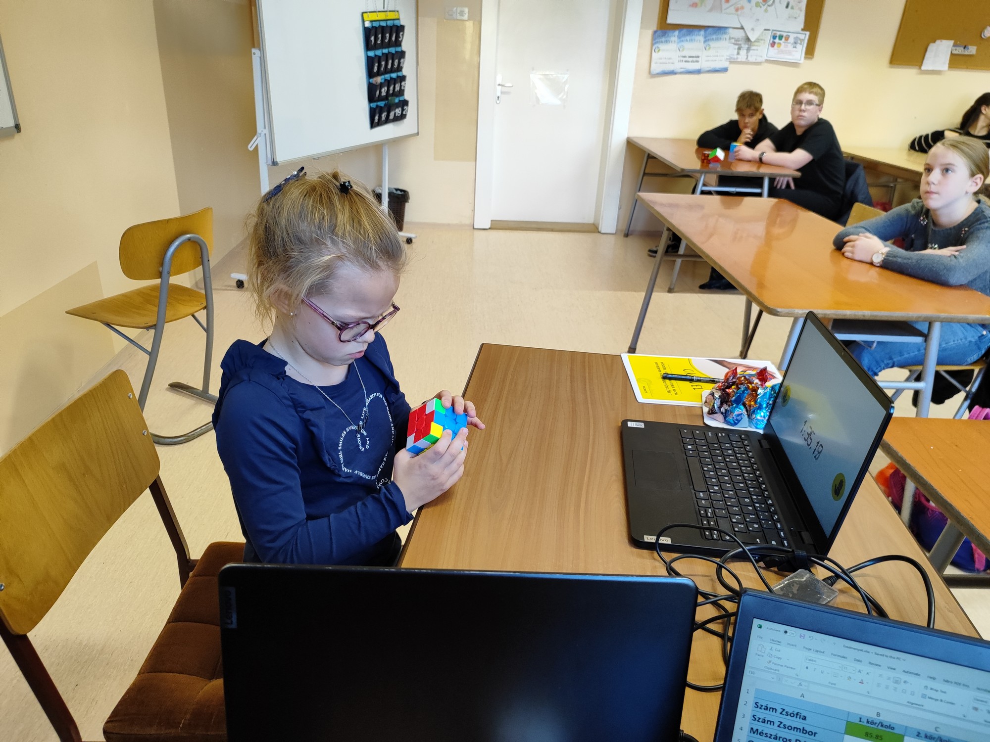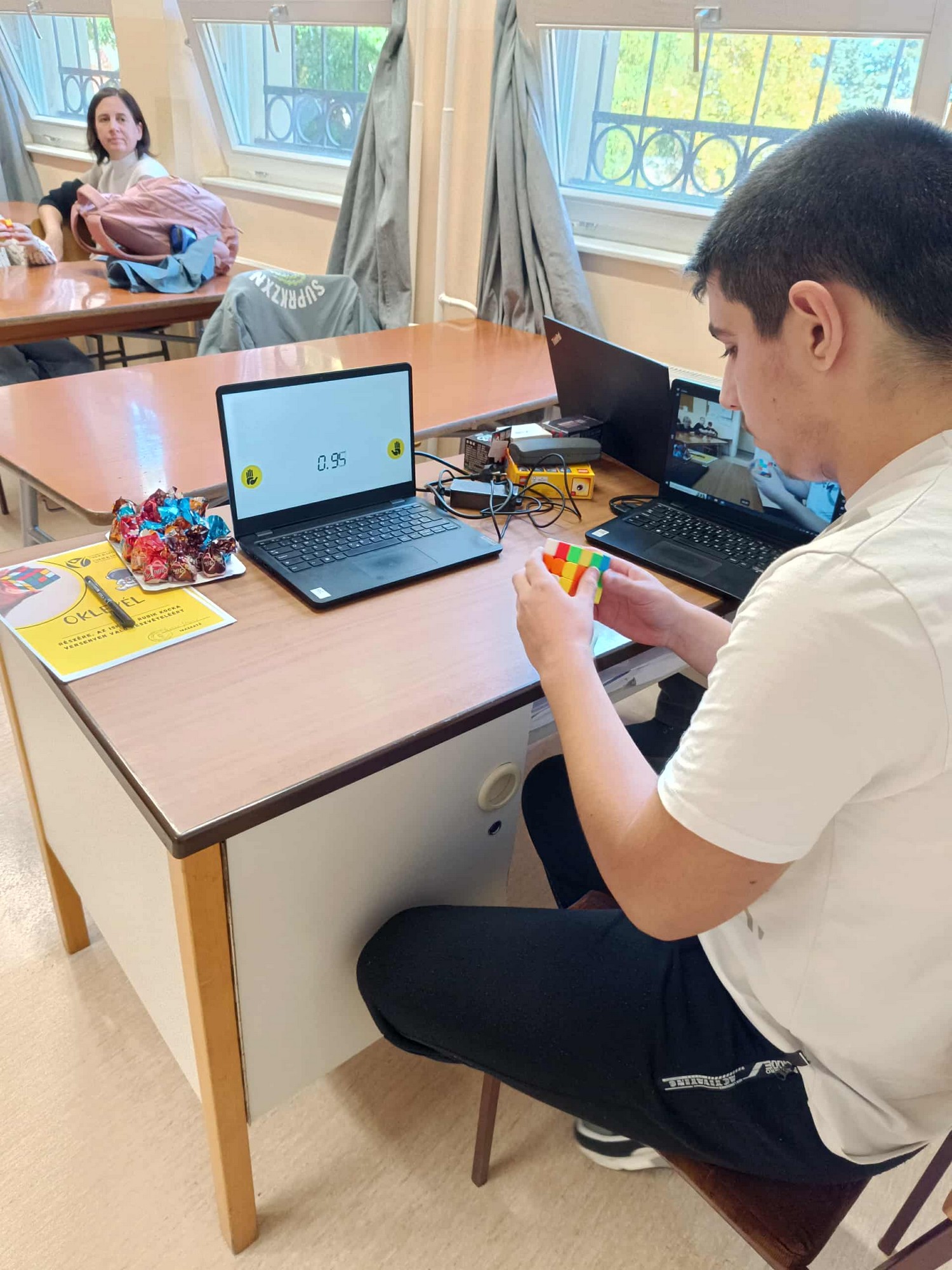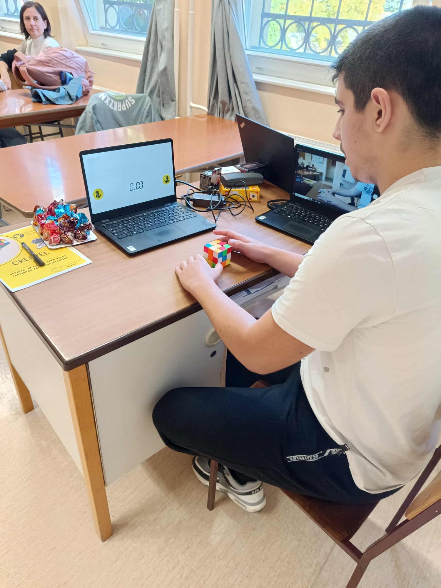Iskolánkban izgalmas Rubik-kocka kirakó versenyt rendeztünk, ahol diákjaink ügyességüket és gyorsaságukat mérhették össze. A verseny jó hangulatban zajlott, a résztvevők lelkesen és koncentráltan dolgoztak a színes kockák kirakásán. A leggyorsabb kirakásokat taps mellett értékes ajándékok is várták. A rendezvény nemcsak szórakoztató volt, hanem fejlesztette a logikai gondolkodást és a problémamegoldó képességet is. Reméljük, hogy jövőre még több lelkes versenyzővel találkozunk!